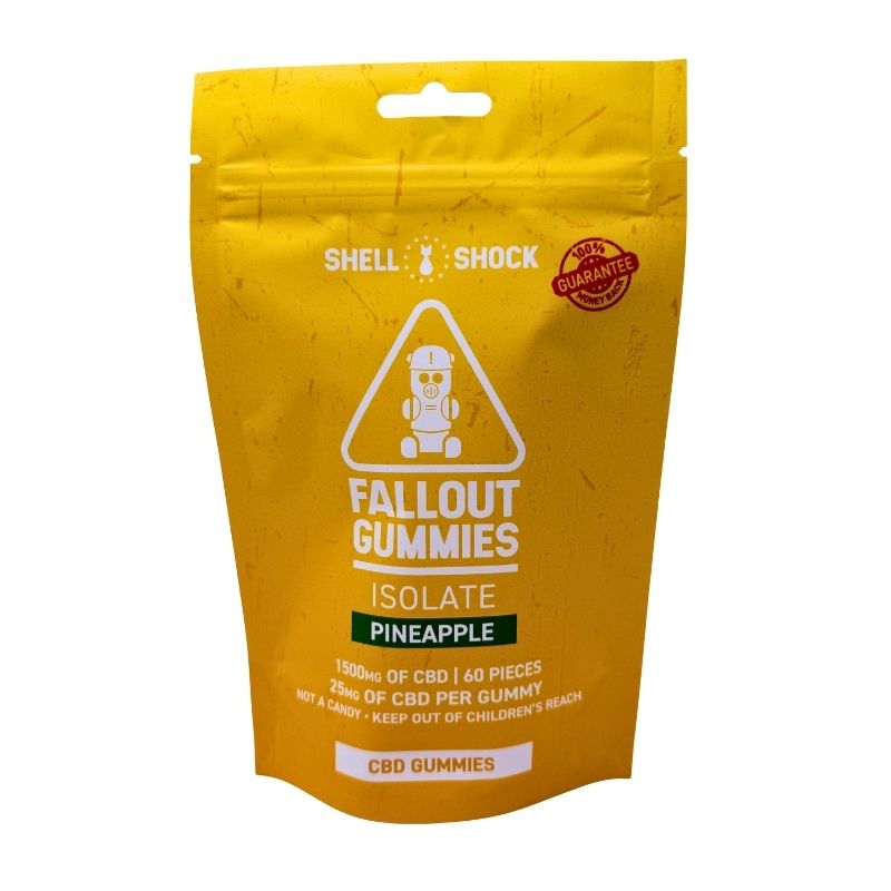 Fallout Gummies: Watermelon: Sugar, Tapioca Syrup Pectin, Water, Citric Acid, Isolated CBD Oil, Pectin, Natural Watermelon Flavor (Water, Gum Acacia, Natural Flavors, Citric Acid), Natural Red Color (Vegetable Juice, Glycerin, Filtered Deionized Water), Purac (Sodium Hydrogen Malate, Malic Acid). Allergens: None Pineapple: Sugar, Tapioca Syrup Pectin, Water, Citric Acid, Isolated CBD Oil, Pectin, Natural Pineapple Flavor (Water, Gum Acacia, Natural Flavors, Citric Acid), Natural Red Color (Vegetable Juice, Glycerin, Filtered Deionized Water), Purac (Sodium Hydrogen Malate, Malic Acid). Allergens: None